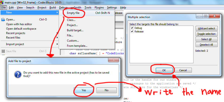 Untuk menambahkan menu kita perlu membuat file tambahan yaitu file 'resource.h' dan 'resource.rc'. Langsung saja, klik File -> New -> Empty File. Ketika ditanya "Do you want to add this new file in the active project (has to be saved first)?", pilih Yes untuk menlanjutkan, lalu ketikan resource.h untuk nama file yang akan disimpan. Lanjutkan dengan memilih OK untuk Multiple Selection :